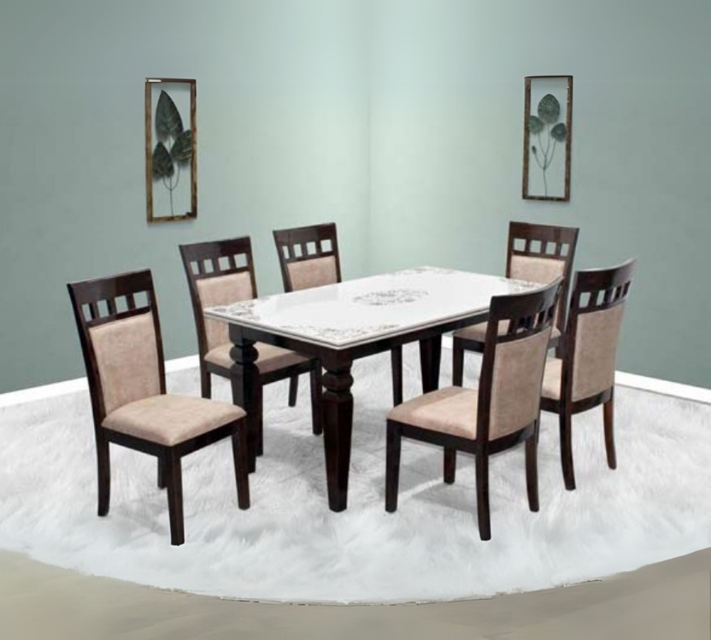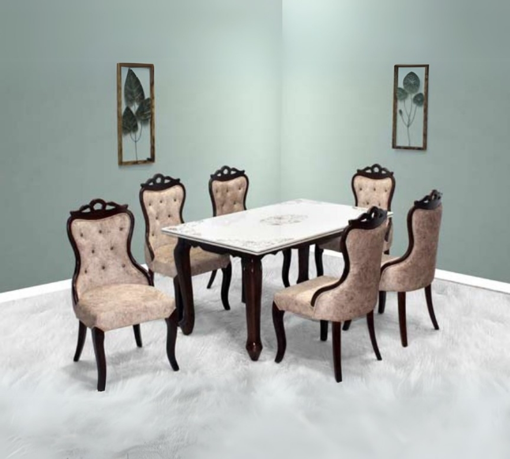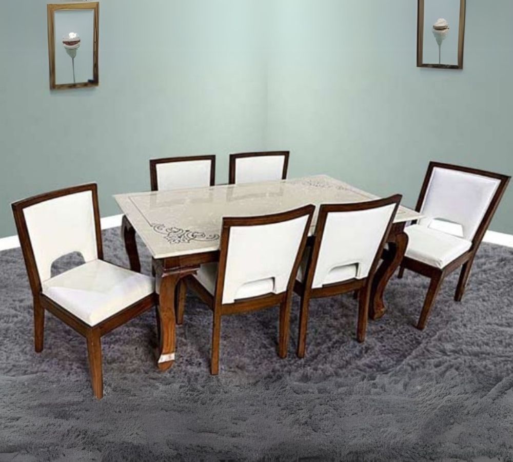 Classic 6-Seater Rectangular Dining Set with Elegant Carved Legs and White Glass Top