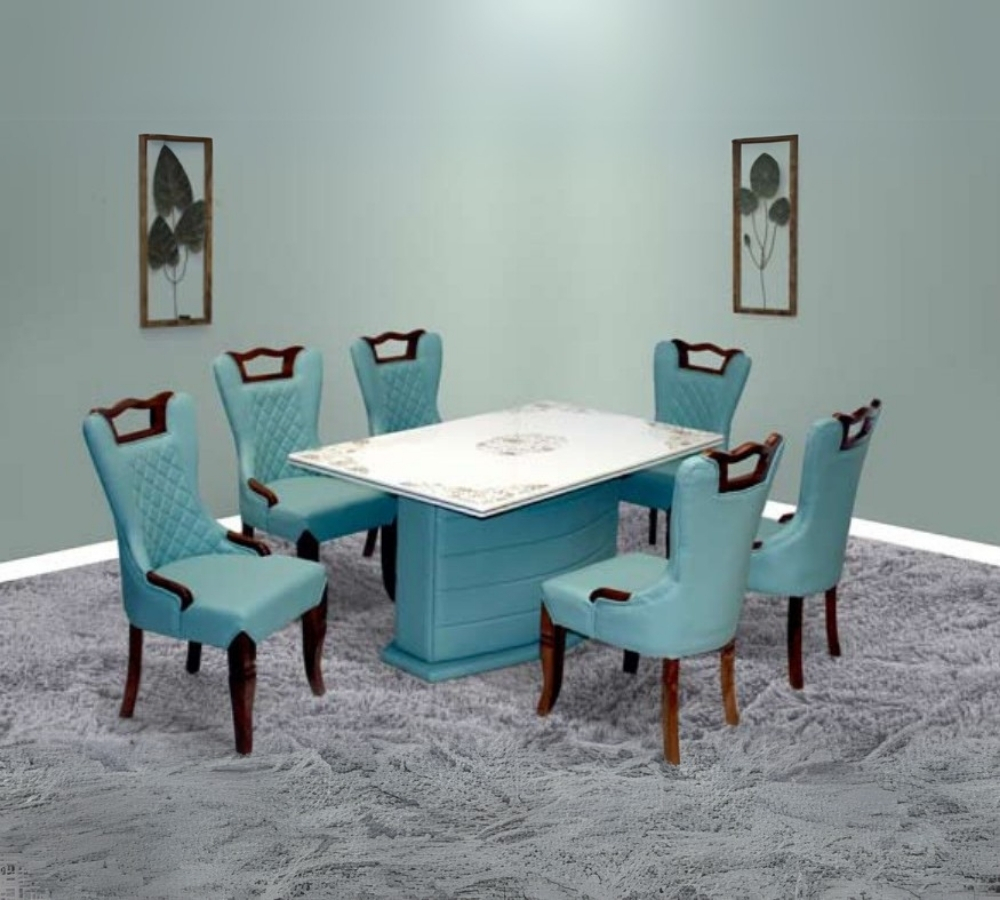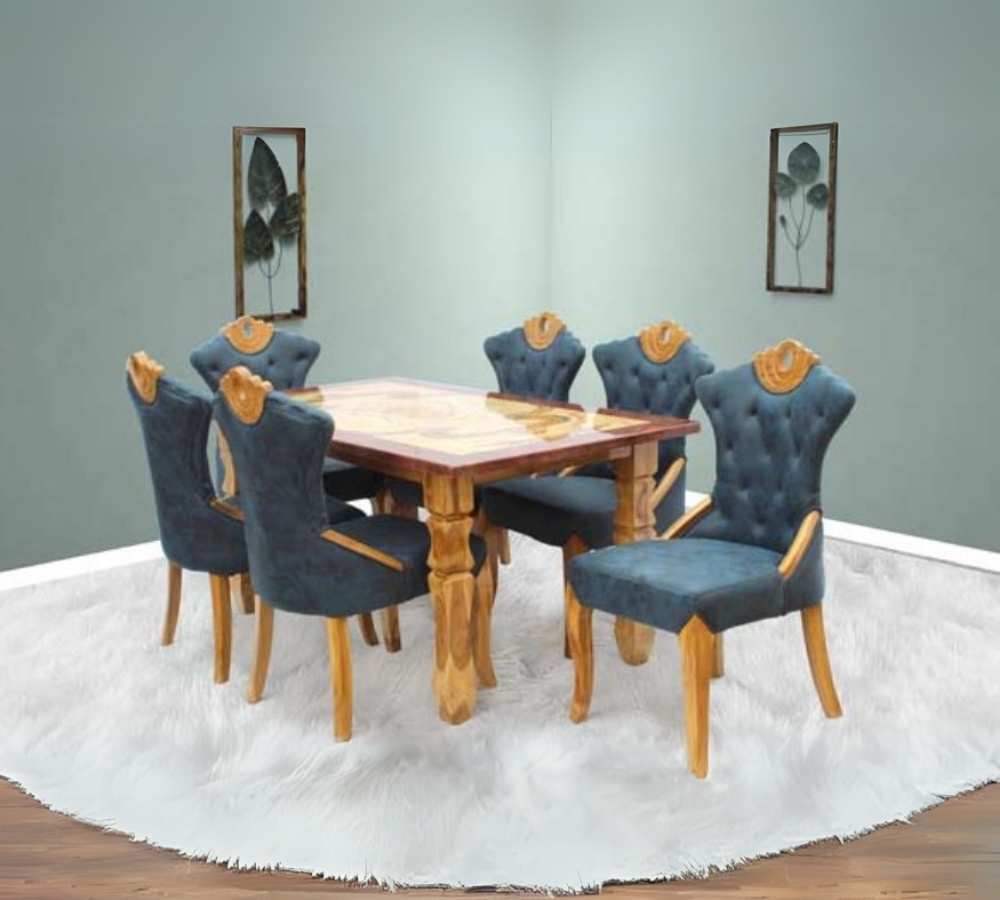 Classic 6-Seater Dining Table Set with Blue Upholstered Chairs and Carved Wooden Frame