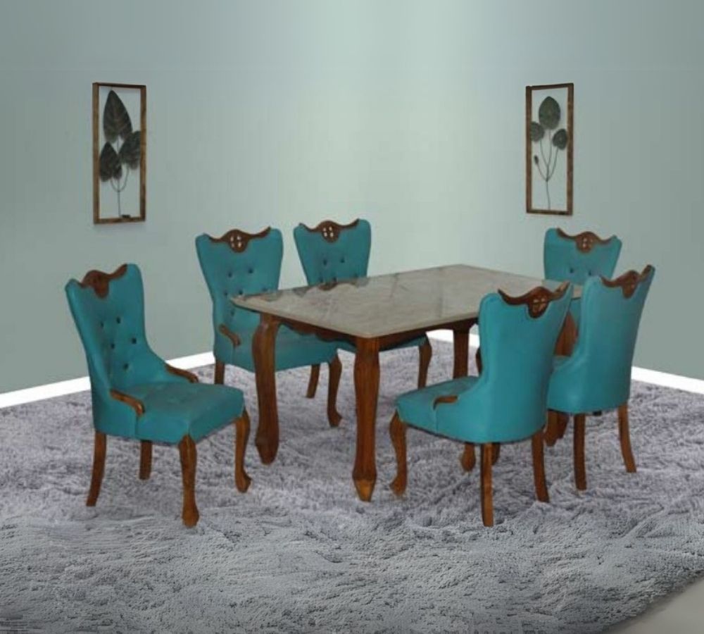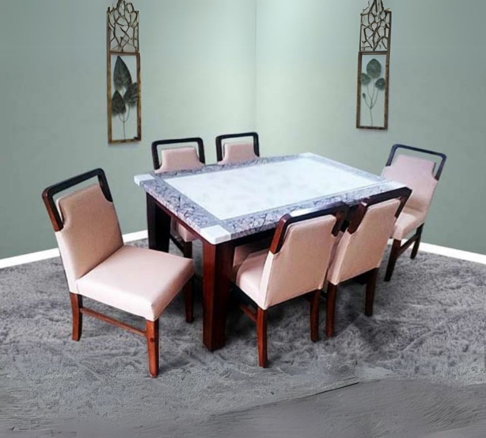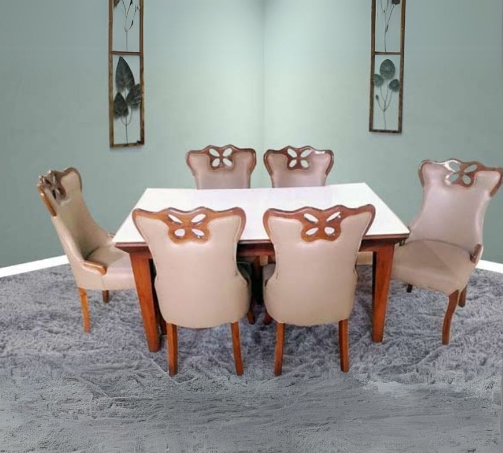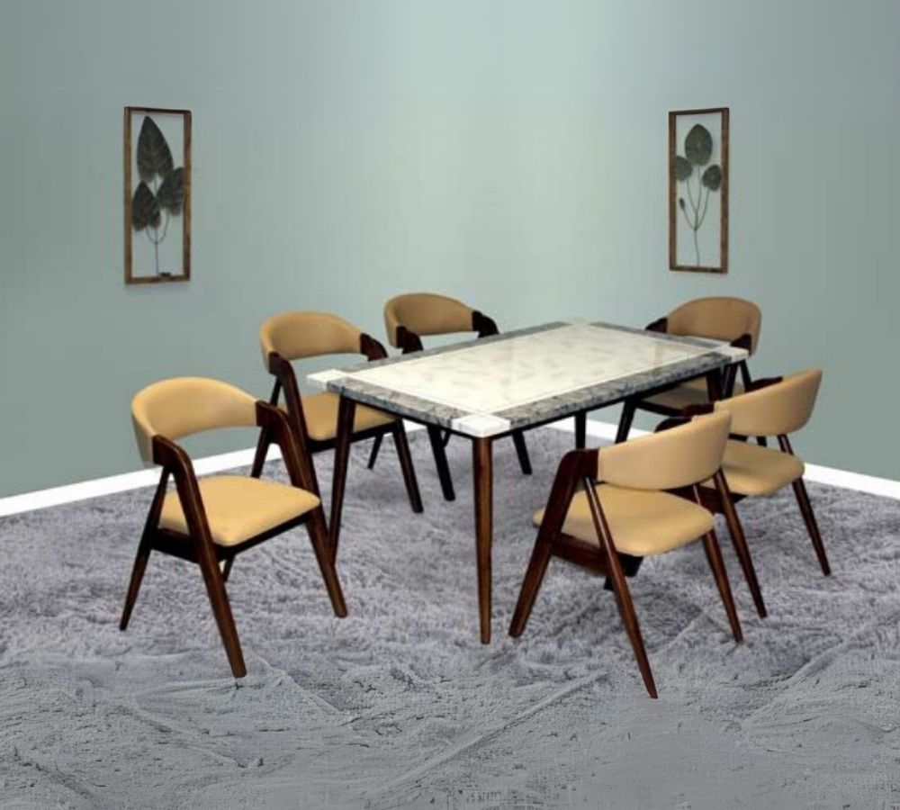 The Beige Quilted Back Marble Dining Set offers a blend of elegance and contemporary design. The tabletop boasts a smooth beige marble finish with delicate natural veining, resting atop a uniquely curved wooden base that adds a stylish flair to the dining area. The six chairs feature comfortable beige upholstery with quilted detailing on the backrests, adding texture and a touch of luxury. Gold accents on the chair legs further elevate the set’s premium appeal, making it ideal for both daily use and special occasions.