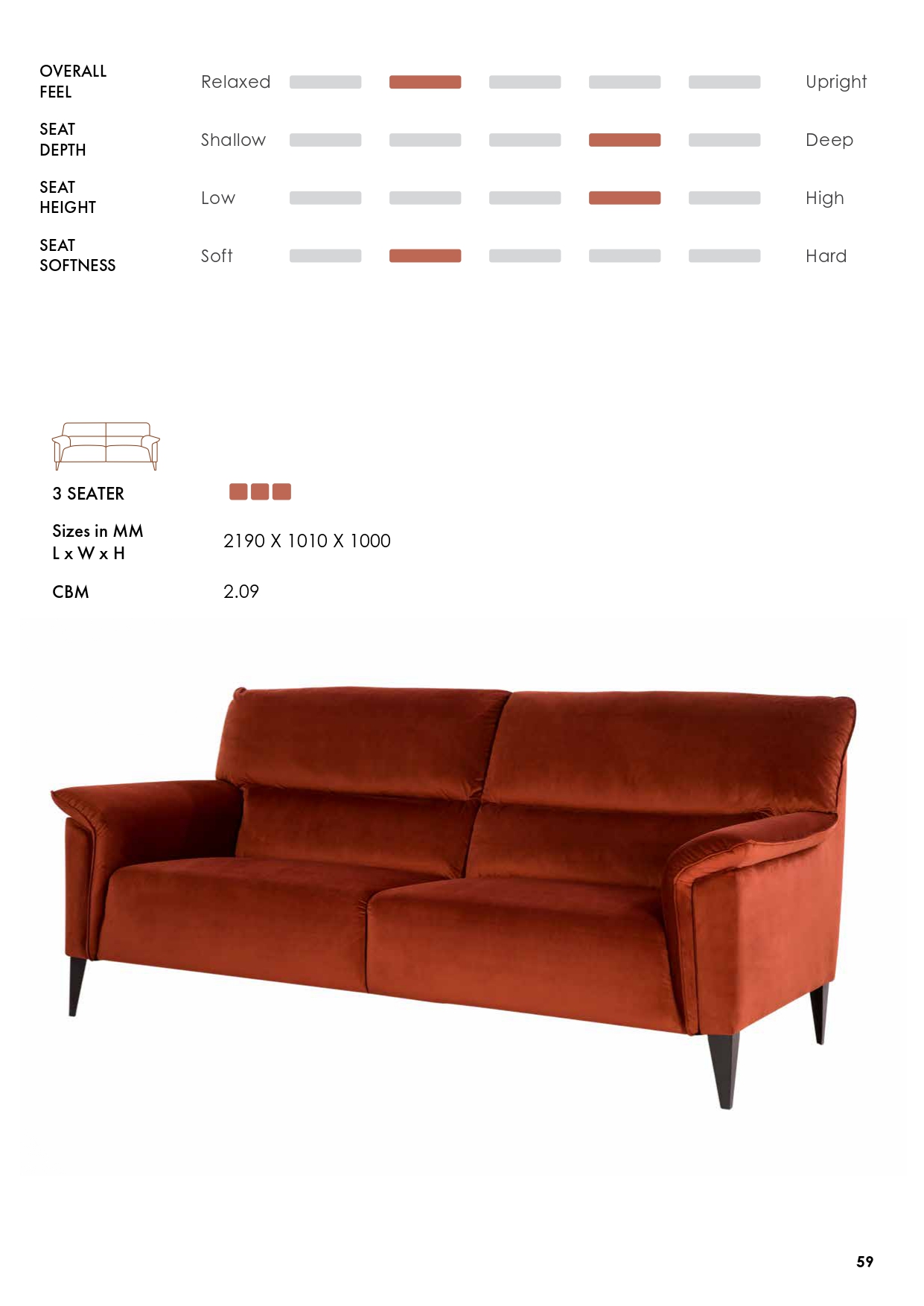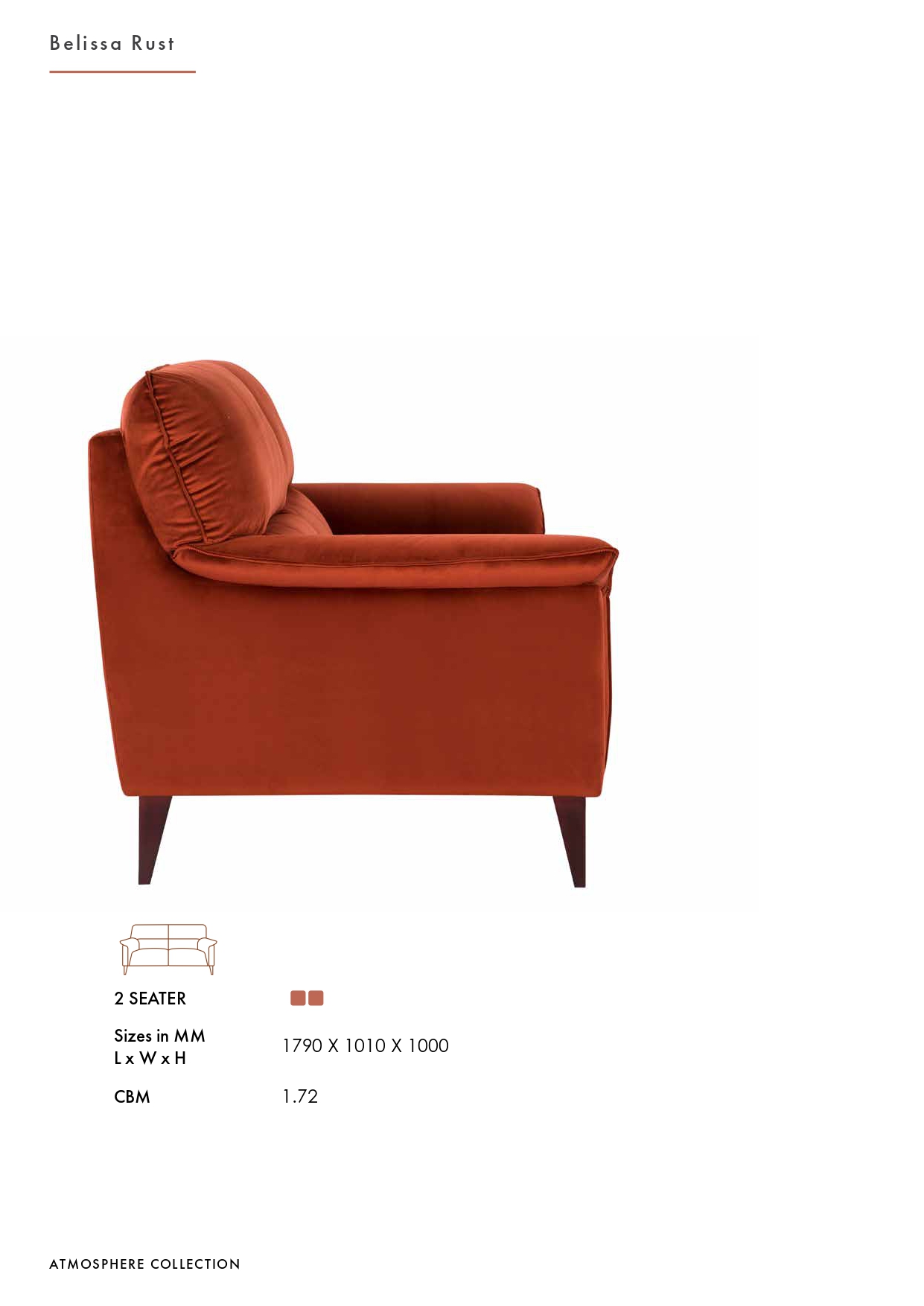 Elevated on tapered dark wood legs, Belissa Rust strikes the perfect balance between grounded stability and visual lightness. Available as a cozy 2-seater loveseat (1790 × 1010 × 1000 mm; CBM 1.72), this collection adapts seamlessly to both intimate lounges and open-plan living spaces. Its casual silhouette and luxurious fabric make Belissa Rust an ideal statement piece for contemporary interiors.