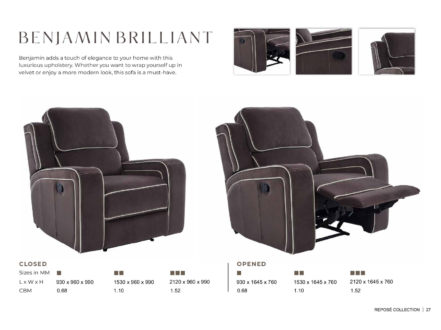 The Benjamin Brilliant recliner offers a perfect blend of style and comfort. Upholstered in rich velvet with contrasting piping, it brings a sophisticated touch to any living space. Designed for those who appreciate both aesthetics and relaxation, the Benjamin recliner features a smooth reclining mechanism that allows you to find the ideal position with ease. Its plush cushioning and elegant design make it a standout piece, perfect for cozying up or entertaining guests in style.