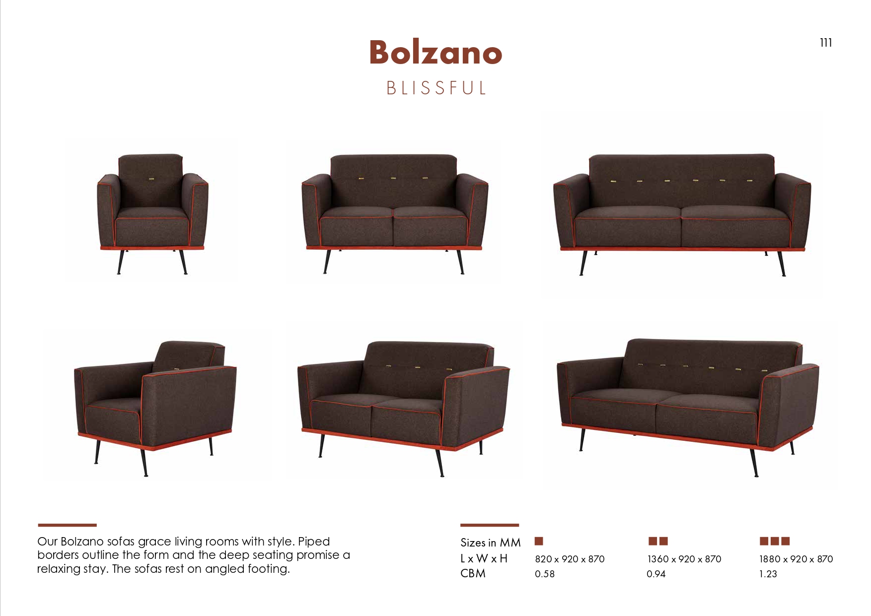 Our Bolzano sofas grace living rooms with style. Piped borders outline the form and the deep seating promise a relaxing stay. The sofas rest on angled footing.