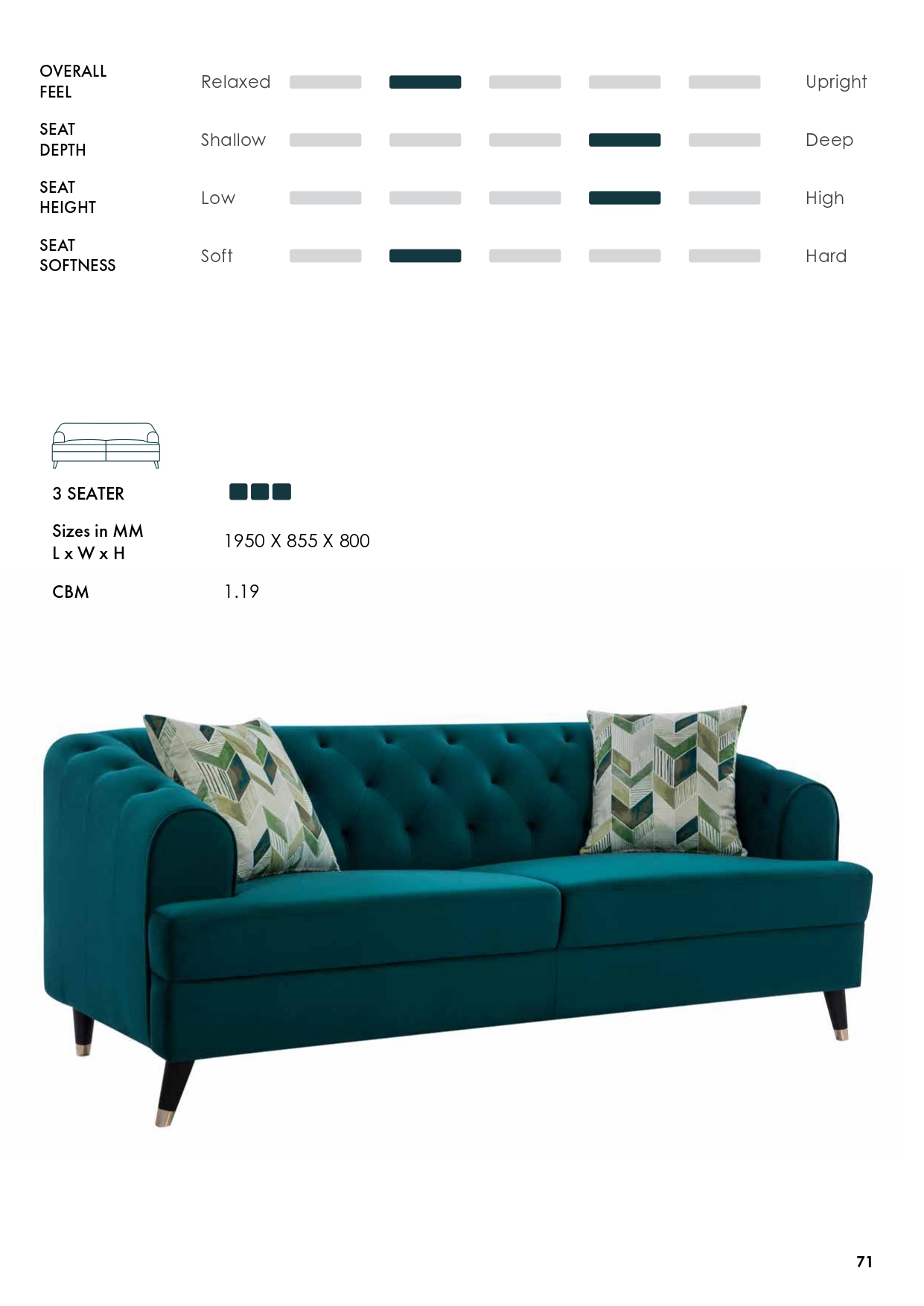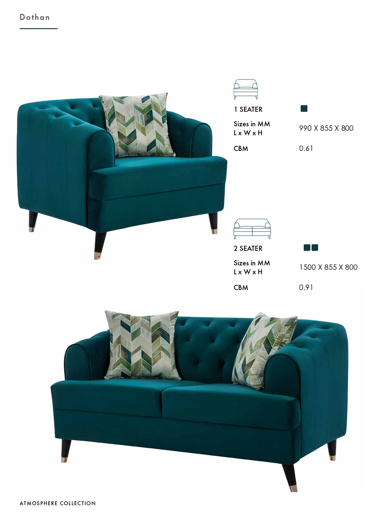 Supported on slim, tapered solid‐wood legs with subtle gold‐tip ferrules, Dothan Teal delivers a light, graceful profile. Available as a cozy 1-Seater (990 × 855 × 800 mm; CBM 0.61) or an elegant 2-Seater loveseat (1500 × 855 × 800 mm; CBM 0.91), this collection adapts seamlessly to both intimate nooks and sophisticated living rooms. Decorative pillows in coordinating geometric prints complete the curated look, making Dothan Teal a versatile statement for modern and traditional interiors alike.