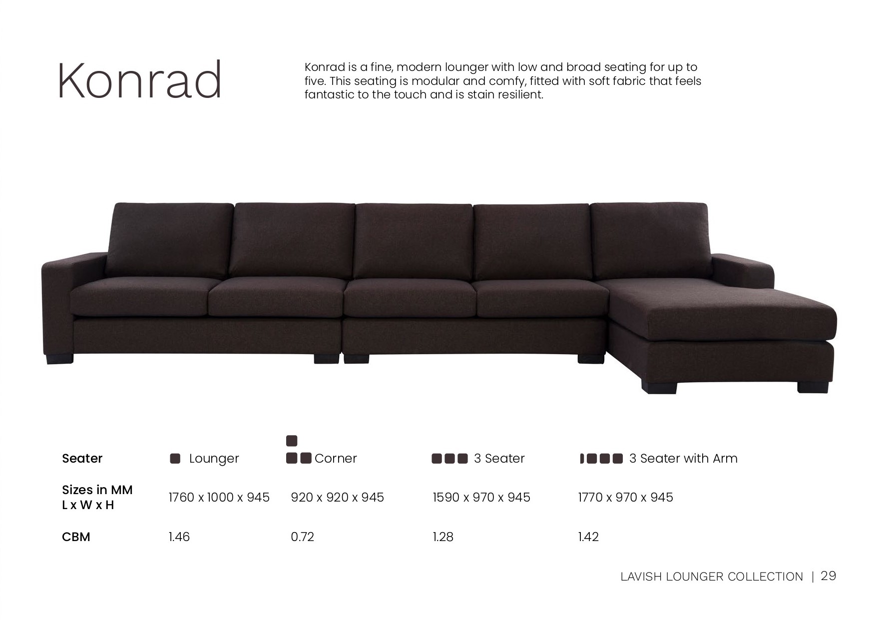 The Konrad sofa combines modern design with ultimate comfort, making it perfect for family living rooms. Featuring low, broad seating, this lounger accommodates up to five people with ease. The modular design allows flexible arrangement to suit your space and lifestyle needs. Upholstered in a soft, stain-resistant fabric, Konrad feels fantastic to the touch and is built for durability. Its simple yet elegant style fits well in contemporary homes, offering a cozy retreat for relaxing or socializing.
