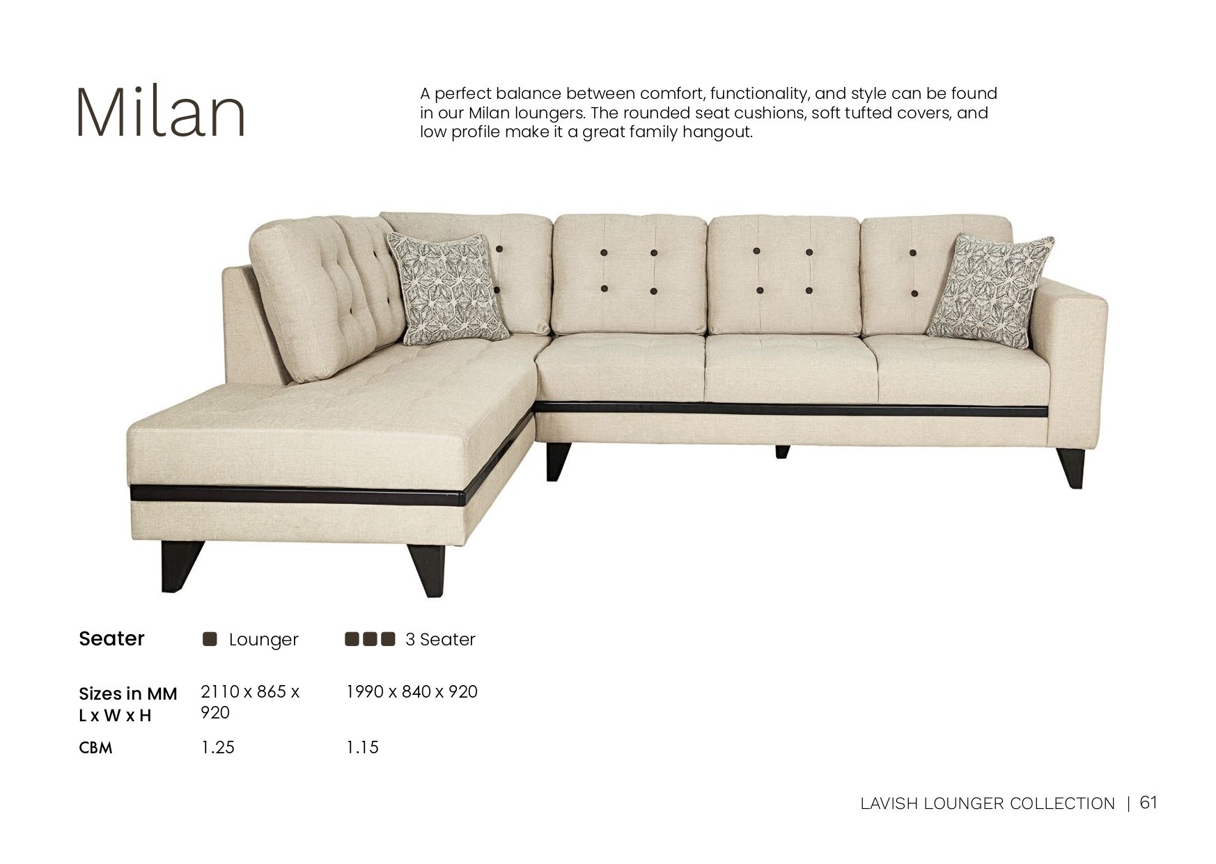 The Milan Lounger combines comfort and practicality with a stylish design, perfect for family living spaces. Its rounded seat cushions and soft tufted covers create a cozy and inviting atmosphere. The low-profile structure enhances the lounge’s modern aesthetic while ensuring easy accessibility and relaxed seating. Upholstered in a light neutral fabric with patterned pillows, Milan fits effortlessly into contemporary and casual interiors. This lounger is designed to be the ultimate family gathering spot, offering both style and long-lasting comfort.