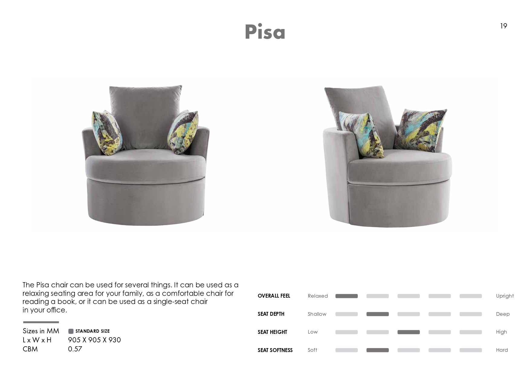 The Pisa chair can be used for several things. It serves as a relaxing seating area for your family, a comfortable chair for reading a book, or a single-seat chair in your office.
