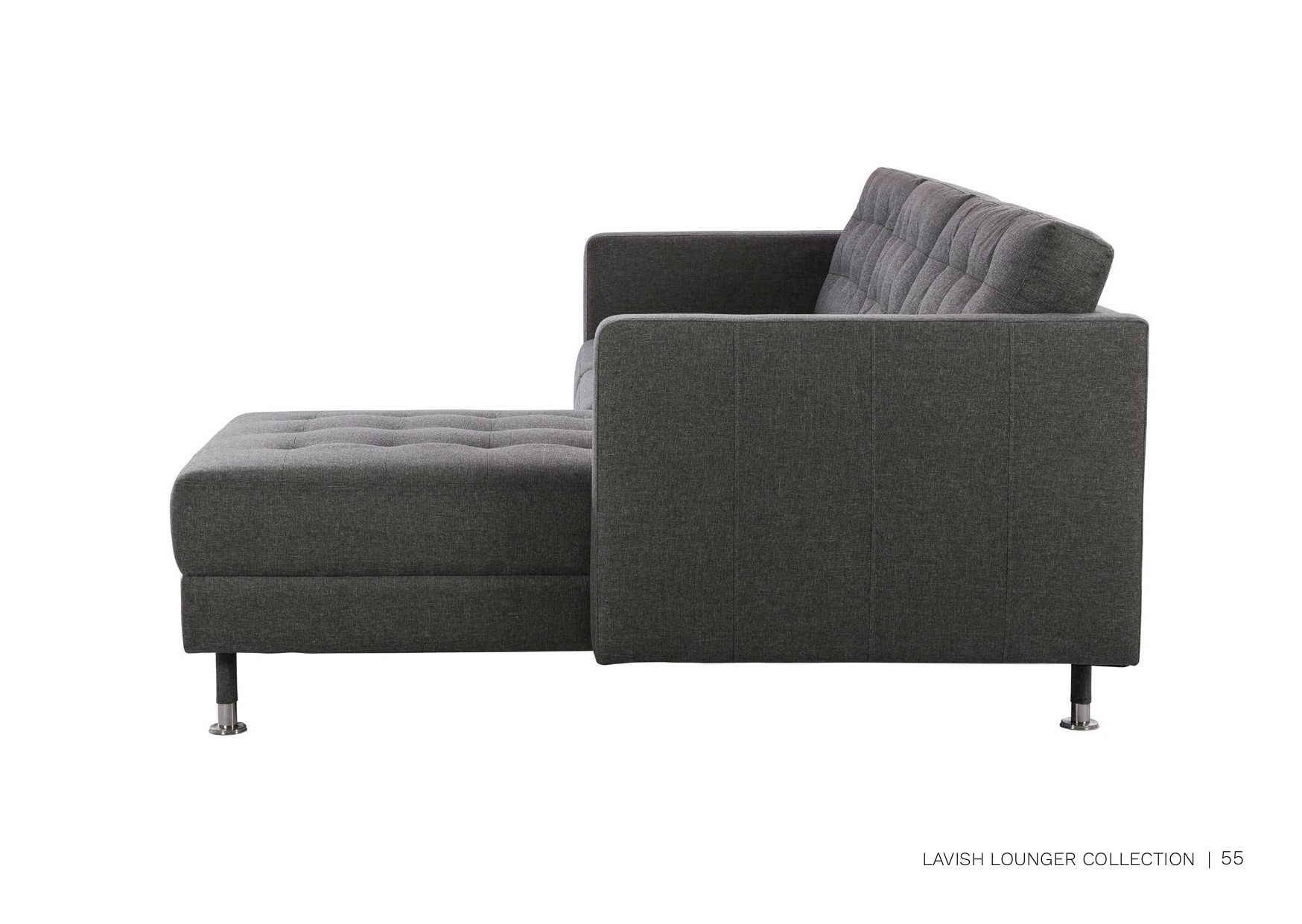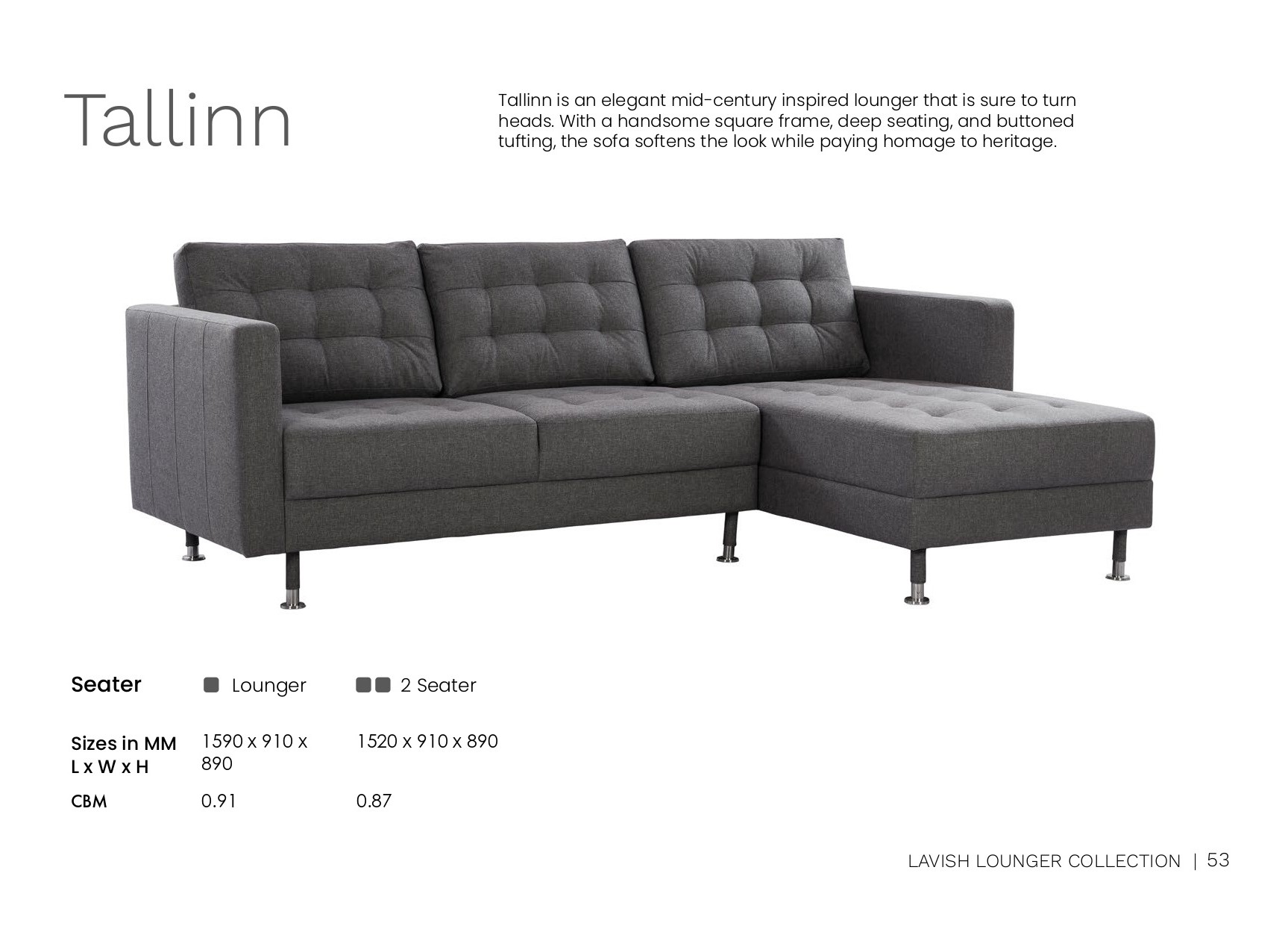 Tallinn is an elegant mid-century inspired lounger with a handsome square frame, deep seating, and buttoned tufting. It softens the look while paying homage to heritage.